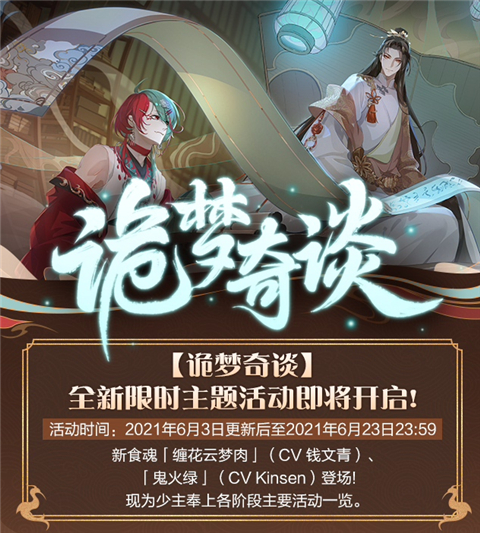 食物语诡梦奇谈是一个在6.3即将上线的全新活动,活动期间会上线两个新的食神缠花云梦肉和鬼火绿,那么这次的活动都会有哪些新玩法出现呢?来跟小编一起看看吧。